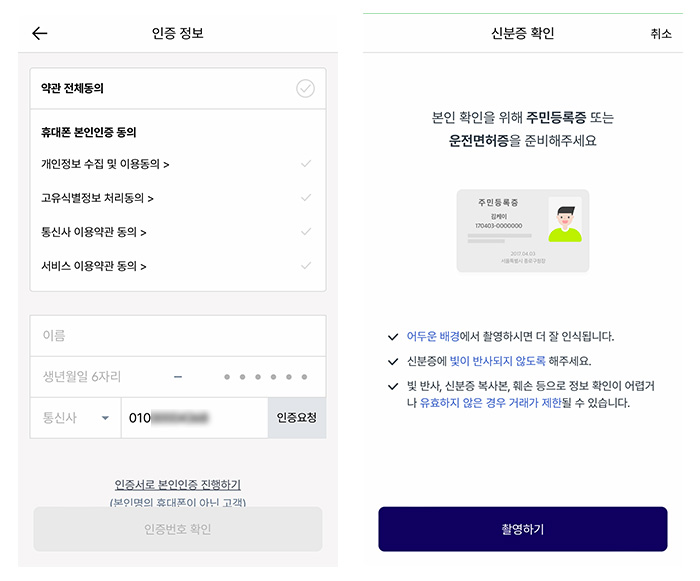 2. 간편비밀번호인데 인증 절차가 좀 많다고 느껴지네요. 아무튼 휴대폰 본인인증을 끝내면 신분증이나 운전면허증을 촬영해서 인증을 진행합니다. 신분증 촬영시에는 어두운 배경에서 촬영하면 더 잘 인식되며 신분증의 빛이 반사되지 않도록 주의하며 복사본이나 훼손 등으로 정보 확인이 어렵거나 유요하지 않은 신분증의 경우는 거래가 제한될 수 있습니다.