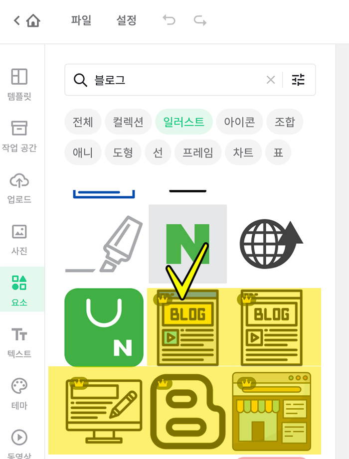 5. 저는 기존에 있던 턱받치고 있는 학생의 모습을 변경해보려고합니다. 해당 이미지를 선택해서 삭제를 했고 좌측의 "요소" 메뉴를 선택해서 블로그라는 키워드로 이미지를 검색했습니다. 쭈욱 내리면서 만들려는 디자인과 어울리는 이미지를 고르고있었는데요. 여기서 "왕관"모양의 아이콘이 붙은 이미지를 확인할 수 있습니다. 이렇게 왕관이 붙은 이미지들은 "프로"나 "엔터프라이즈" 유료 요금제를 사용하는 고객들이 이용이 가능합니다.