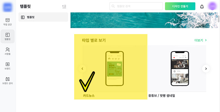 2. 미리캔버스에서 템플릿을 선택하면 "타입 별로 보기"에서 원하는 디자인 타입을 고릅니다. 블로그 썸네일의 카테고리는 없어서 정사각형의 이미지 템플릿이 있을법한 "카드뉴스"와 "소셜 미디어 정사각형"에서 고르면좋겠죠. 저는 그냥 카드뉴스에서 템플릿을 골랐습니다.