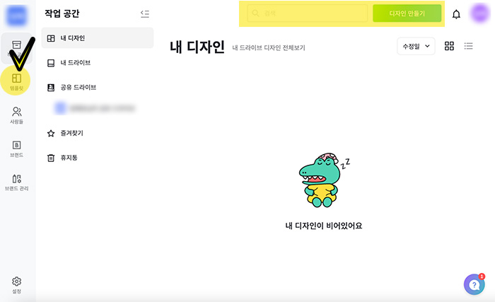 1. 카카오나 네이버 등으로 가입해서 로그인하면 처음 화면은 "내 디자인" 메뉴의 빈 공간에 악어(미리캔버스 마스코트)가 잠자고 있습니다. 비어있는 내 디자인을 채워야겠죠. 좌측의 "템플릿" 혹은 중앙 상단의 "검색"에서 원하는 템플릿을 찾아봅시다. 템플릿은 미리 만들어진 디자인 세트 정도로 생각하시면됩니다. 이미 만들어진 디자인을 고르고 거기에 요소들(이미지 또는 글씨 등등)을 변경해서 저에게 맞는 이미지로 다시 가공하는거죠.