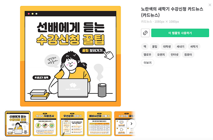 3. 미리캔버스의 템플릿은 "선배에게 듣는 수강신청" 무료 템플릿입니다. 딱 블로그 썸네일로 괜찮을 것같아 골랐는데요. 이렇게 무료 템플릿을 선택하면 사이즈와 키워드들이 오른쪽에 나타납니다. 키워드로 검색도 가능하니 비슷한 디자인을 찾는다면 해당 키워드들을 선택해보세요. "이 템플릿 사용하기"를 눌러 이제 디자인을 편집해봅시다.