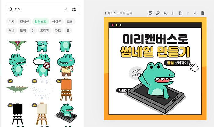 8. 대표 이미지로 넣었던 학생 일러스트가 마음에 안들어서 "요소 -> 일러스트" 체크한 뒤에 "악어"키워드로 검색해서 미리캔버스 마스코트 악어가 스마트폰에서 나와 손짓하는 그림을 골랐습니다. 딱 어울리네요. 텍스트도 "미리캔버스로" "썸네일 만들기"로 변경했고 꿀팁보러가기는 마음에 들어서 삭제하지 않고 그대로 두었습니다. 이때 글씨가 이미지에 가려지는부분들이 생기는데요.