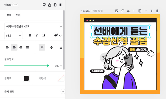 7. 스마트폰을 보는 학생으로 이미지를 변경했고 크기를 조절해서 정사각형 테두리 안에 잘 들어오게 맞췄습니다. 그리고 이제 텍스트를 변경해야겠죠. 디자인에서 변경하고 싶은 글씨를 선택한 뒤에 원하는 문구를 입력하면 됩니다.