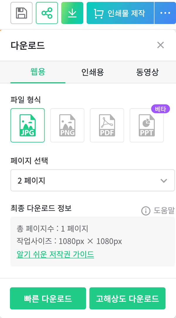 템플릿을 카드뉴스로 선택했기에 1~6개의 페이지가있는데 저는 2번 페이지에서 수정을했으니 2번 페이지만 선택해서 다운로드하겠습니다. 최종 다운로드 정보가 나오네요. 1080px X 1080px 해상도에 1개의 페이지만 저장! 빠른 다운로드와 고화질 다운로드가 있는데 둘다 큰차이가 없었습니다. (해상도와 용량이 같았거든요)