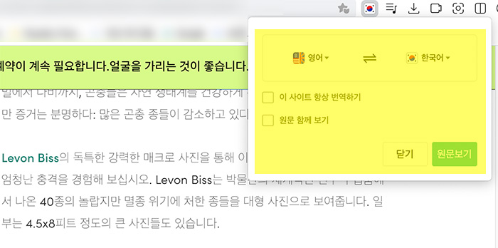 미국자연사 박물관 웹서핑하다가 웨일 브라우저의 번역 기능으로 웹페이지를 번역시켜봤습니다. 사이트를 항상 번역하기, 원문 함께 보기의 옵션이 있으며 기존의 웹페이지로 보고 싶으면 "원문보기"를 선택하면됩니다.