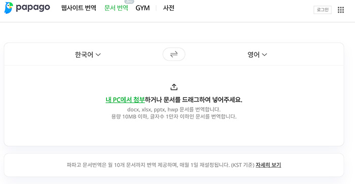 3. 파파고의 문서 번역 기능입니다. PC의 번역하고 싶은 문서를 드래그앤 드롭하거나 불러와서 문서를 번역하는 기능인데 월 10개의 문서까지 번역을 제공하고 매월 1일 한도가 풀리는 방식입니다. 외국 제품들의 메뉴얼이나 이런거 잠깐씩 찾아볼 때 괜찮겠네요.