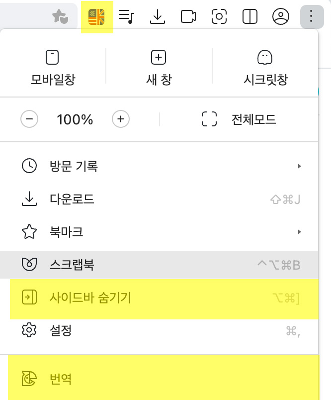 다른 방법으로는 점3개를 선택하면 웨일의 메뉴가 나타나는데 여기에서 "번역" 기능을 선택해도 좋고 "사이드바 보기"를 선택하면 오른쪽에 사이드바에 네이버의 기능들이 추가되는데 거기에도 "번역"이 있으니 입맛에 맞게 사용하세요.