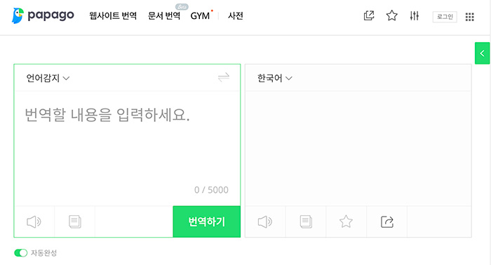 PC의 브라우저에서 접속해서 사용하는 파파고의 번역기모습입니다. 웹사이트에서 복사한 내용을 붙여 넣기하면 자동으로 언어를 감지해서 한국어 또는 다른 언어로 번역을 해줍니다. 성능은 괜찮은 편이지만 번역이 잘못되는 경우도 있으니 확인이 필요합니다.