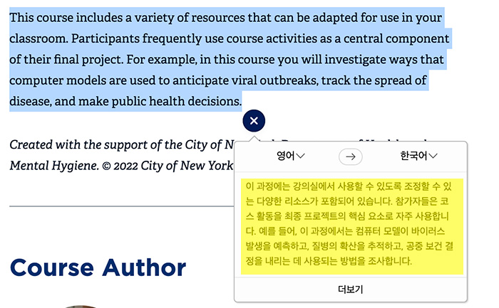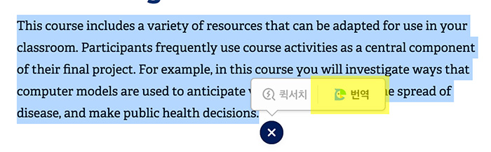웹페이지를 전체 번역하는 기능 말고도 원하는 단어나 문장을 번역할 수 있습니다. 웹페이지에서 번역을 하고 싶은 부분을 드래그하면 돋보기에 번개가 그려진 아이콘이 나타납니다. 이걸 선택하고 "번역"을 누르면 선택한 부분의 단어나 문장을 자동으로 번역시켜줍니다.