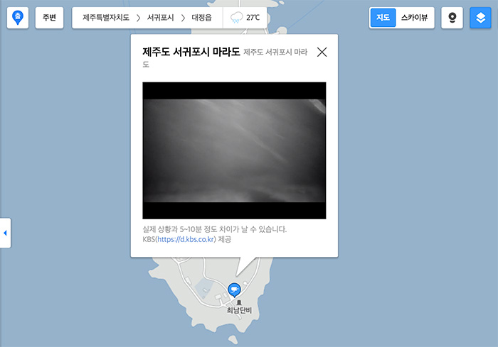 위의 2개의 방법 (네이버와 다음 지도를 이용한 CCTV 확인)으로 태풍 상황을 볼 수 있지만 네입버의 경우는 마라도와 다른 지역의 CCTV 정보가 없고 카카오맵의 경우는 마라도의 CCTV가 연결되어 있습니다.