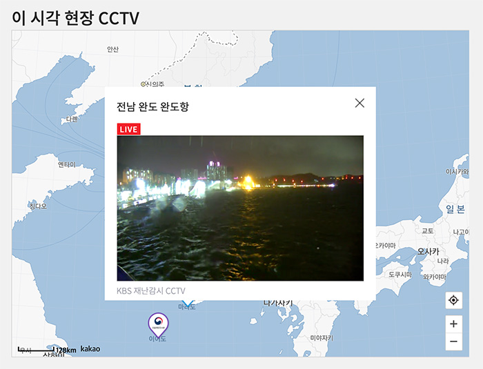 우선 이 시각 현장 CCTV의 지도에서 전남 완도 쪽의 상황은 어떠한가 살펴봤는데 아직은 큰 파도나 비의 모습은 보이지 않네요. 그래도 파도가 계속 일렁이는 모습이 위태위태합니다.