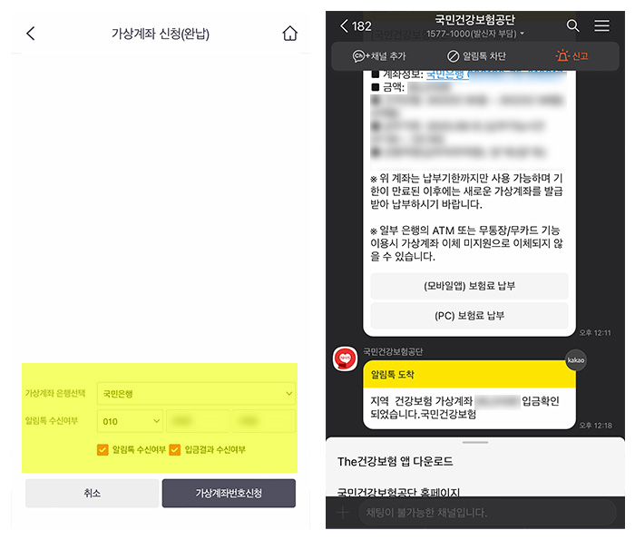 가상계좌를 신청하면 입금할 은행과 전화번호를 입력하고 알림톡 수신여부와 입금 결과 수신 여부를 체크합니다. 문자로 올 줄 알았는데 알림톡을 보니 카카오톡으로 메시지가 왔습니다. 입금할 계좌와 금액 확인하고 건강보험료를 입금했더니 확인 톡까지 깔끔하게 도착했습니다.