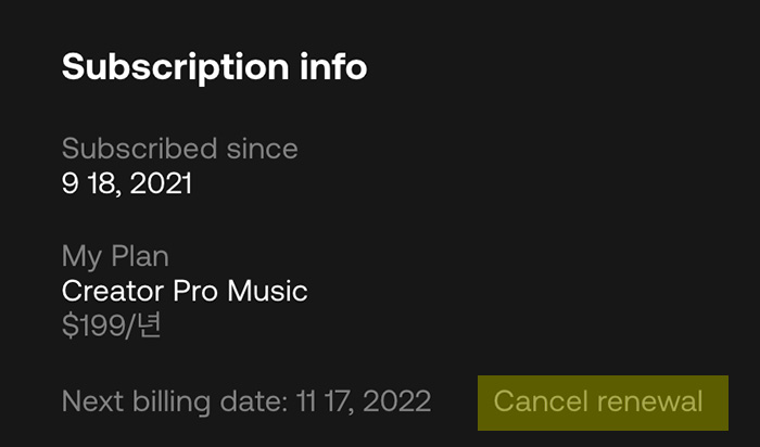 "Subscription info" 에서 하단의 "Cancel renewal" 을 선택해서 자동갱신을 취소합니다.