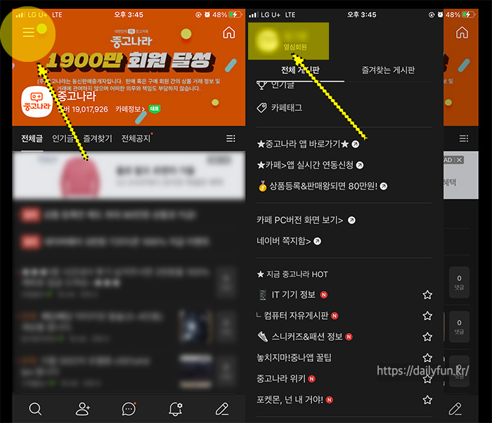 1. 네이버 카페 앱이나 모바일에서 작성한 글과 댓글을 삭제하고 싶은 카페로 접속합니다. 모바일 네이버 카페 화면에서 왼쪽 상단의 줄3개 아이콘을 선택하면 자신의 프로필이 나타나는데 프로필을 터치해주세요.