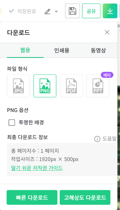 5. 네이버 블로그 타이틀 이미지의 중앙 부위에 자신의 블로그 이름이나 다루는 주제들을 입력하고 위치를 선정한 다음 모든 수정이 끝나면 미리캔버스 상단의 다운로드 아이콘을 눌러 "고해상도 다운로드"를 선택해주세요.
