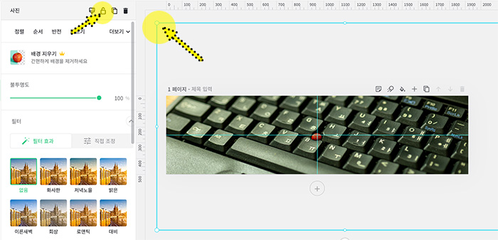3. 등록한 이미지의 모서리 부분을 잡고 늘려서 (상하 좌우는 잡고 늘리면 비대칭으로 늘어남 모서리로 늘리세요.) 캔버스에 꽉 차게 타이틀 이미지를 채웁니다. 크기나 위치가 만족스러우면 자물쇠 아이콘을 눌러서 배경 이미지가 움직이지 않도록 고정해주세요.