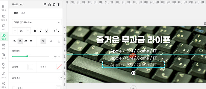 무료 이미지 사이트에서 이미지를 받아도 좋고 저는 촬영했던 이미지가 있어서 "업로드"에서 촬영한 노트북 자판 이미지를 불러왔습니다. 최대 25MB 용량의 이미지를 업로드할 수 있습니다. 업로드하고 해당 이미지를 선택하면 캔버스에 이미지가 등록됩니다.