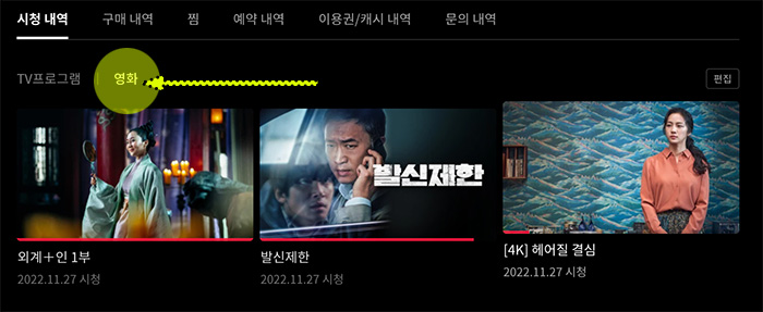 기존에 있었던 티빙의 시청 목록이 사라진 것을 확인할 수 있습니다. 하지만 "영화" 부분도 삭제를 해줘야겠죠.
