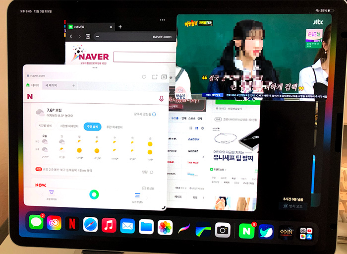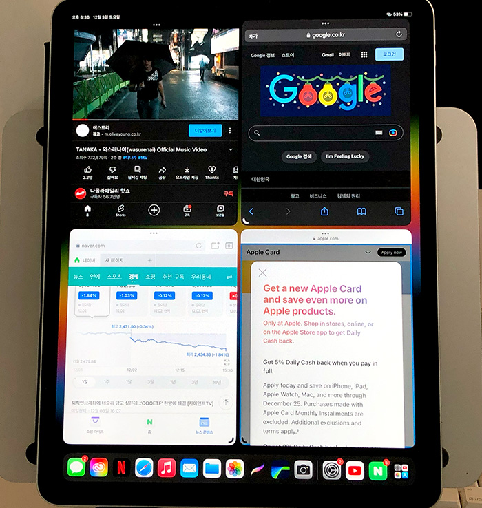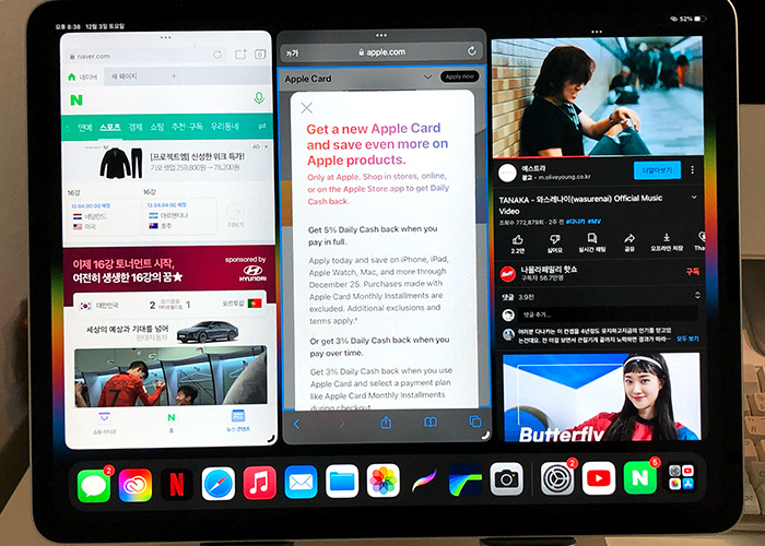 가로 화면 멀티태스킹 기능이라서 앱들을 윈도(창)처럼 활용이 가능합니다. 우선은 간단하게 네이버 앱 / 사파리 / 유튜브 이렇게 3개의 앱을 한 화면에 분할시켜 사용을 해봤습니다.