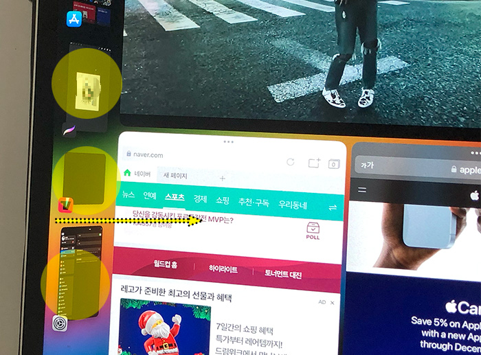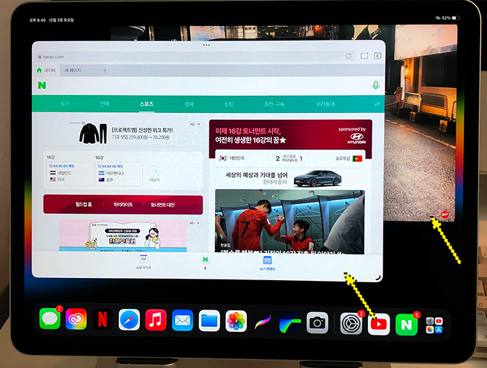 아이패드 화면에서 앱들을 나눠서 구성하는 방식도 있고 하단의 사진처럼 유튜브 앱은 백그라운드에서 재생시키고 그 위에 네이버 앱을 켜서 이용하는 방법도 가능합니다.