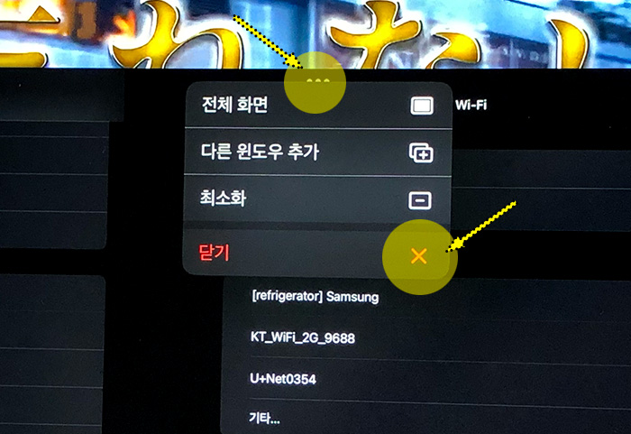 앱의 상단 중앙에 보면 점 3개 아이콘이 있습니다. 이를 선택하면 "전체 화면/다른 윈도 추가/최소화/닫기" 메뉴가 나타납니다. "닫기"를 눌러서 앱을 종료할 수 있고 다른 윈도우를 추가할 수도 있습니다.