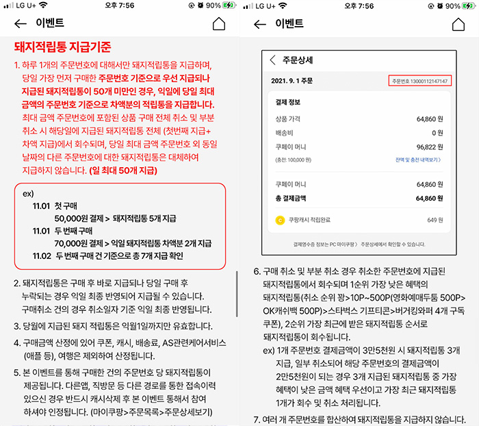 • 1일 1개의 주문번호로 최대 50개의 돼지 적립통 지급