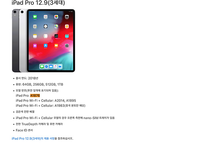 와이파이 전용 모델이라서 모델명이 A1876이고 셀롤러 모델과 중국 본토 모델의 경우는 모델명의 차이가 있습니다. 간략한 스펙이 나오고 하단에는 자세한 제품 사양을 확인할 수 있는 링크도 있습니다.