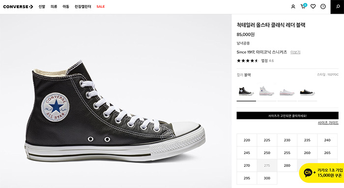오랜만에 운동화 구경하다 컨버스에서 카카오톡으로 가입하면 주는 할인 쿠폰으로 척테일러 올스타 레더 아이로봇을 구매했습니다. 기존 가입자는 발급이 없었고 신규 가입으로만 주는 쿠폰이라 나름 저렴하게 구입했네요.