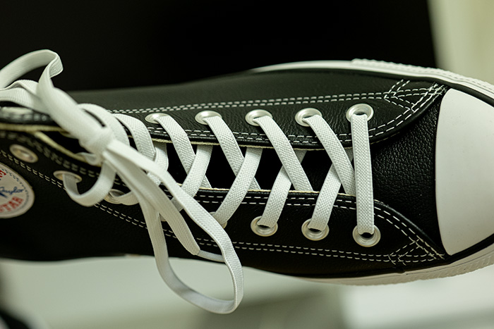 컨버스에 장착된 기본 신발끈보다 살짝 얇은 느낌인데 그렇게 큰 차이는 없어 보였고 대신 소재가 달라서 신발끈의 느낌이 매우 다릅니다. 재질이 다르니 뭐 어쩔 수 없는데 살짝 이질감이 드는 느낌의 고무끈.