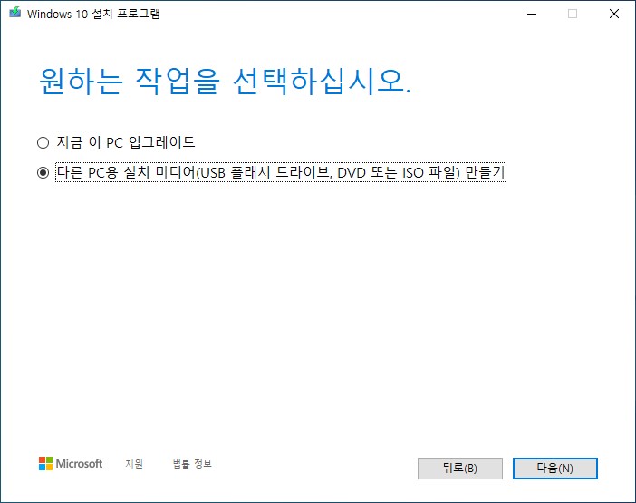 저는 한번 윈도우10 설치 USB를 만들어서 다른 노트북이나 데스크탑에도 사용할 예정이라 설치 미디어에 만들기를 선택했습니다.