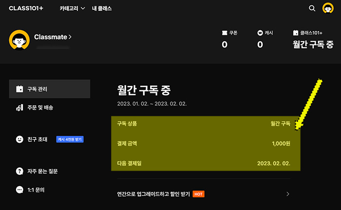 클래스101에 가입해서 마이페이지에서 "월간 구독" 결제금액 "1,000원" 다음 결제일까지 확인을 했습니다. 이제 2023년 02월 02일에 결제가 진행되니 클래스101의 강의들을 들어보고 괜찮으면 계속 결제해서 구독을 해야겠죠.