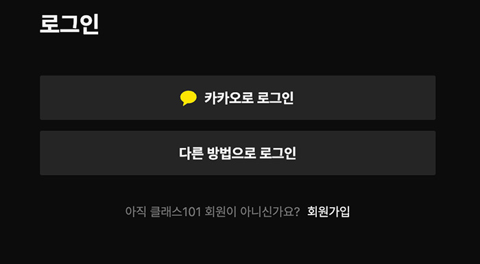 클래스101플러스의 월간 구독 1,000원 이벤트에 참여하려면 우선 로그인을 해야 합니다. 카카오로 로그인을 할 수 있고 아니면 구글, 네이버, 애플, 페이스북 계정으로도 가입이 가능합니다. 저는 그냥 간편하게 카카오톡으로 진행했습니다.