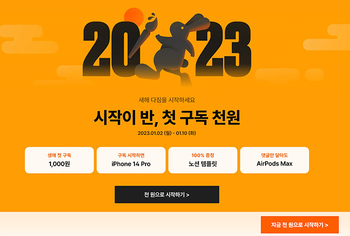 2023년 1월 기준으로 진행 중인 이벤트입니다. "월간 구독 첫 달 1,000원" 이벤트가 진행 중입니다. 이미 2022년에 클래스 101 플러스 론칭을 하면서 첫 달 1,000원 이벤트를 진행했는데 아마 당분간은 계속 유지할 것 같습니다.