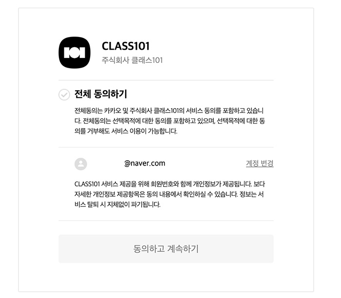 간편하게 클래스101의 전체 동의를 하여 가입이 완료됩니다. (필수 영역은 체크를 하고 선택 영역은 읽어 보시고 그리 중요하지 않으면 체크를 해제해주세요.)