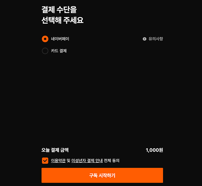 이벤트라서 월간 구독의 가격인 "첫 달 1,000원"으로 변경된 모습을 확인할 수 있습니다. 다음 달부터는 19,000원이 결제되는 방식이고 앞서 말했듯 넷플이나 티빙등의 서비스와 비슷합니다.