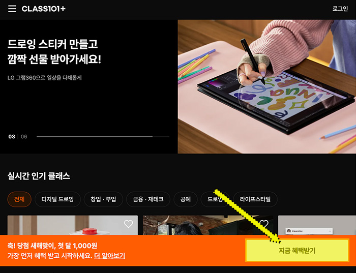 혹시나 위의 링크의 이벤트 기간이 끝났다면 클래스 101 플러스 홈페이지에 접속하면 하단의 배너에 "첫 달 1,000원" 혜택 받기를 찾아보세요.(아마 월별로 이벤트 내용이 달라져서 해당 포스팅의 내용에 차이가 있을 수 있습니다.)