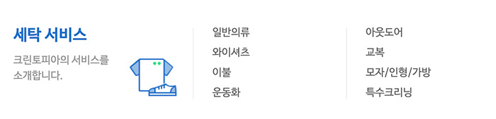 크린토피아에서 세탁이 가능한 품목은 일반의류, 와이셔츠, 이불, 운동화, 아웃도어, 교복, 모자, 인형, 가방, 특수크리닝의 품목들을 다양하게 세탁이 가능합니다.