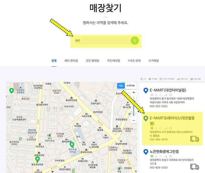 크린토피아의 홈페이지에서 상단의 "매장찾기"를 이용해서 자신이 세탁물을 맡기려는 지역을 검색합니다. "대전"으로 검색했을 경우 홈페이지 우측에 크린토피아 매장들의 목록이 나타납니다.
