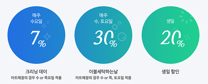 매주 수요일은 크리닝 데이로 7%의 할인을 받을 수 있습니다. 이마트나 마트 내부에 입점한 매장에서는 수요일 또는 목요일에 해당 할인이 적용됩니다.