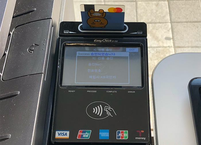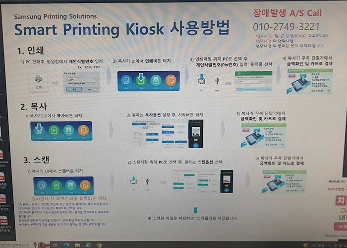 무인복합기 옆에 위치한 카드리더기에 카드를 넣어 결제를 진행합니다. 결제 후에 바로 프린트가 출력됩니다.