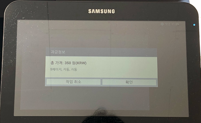 저는 5개의 페이지 흑백으로 인쇄하는거라 총 350원의 금액이 표시됩니다. 맞다면 "확인" 원하지 않으면 "작업취소"를 선택합니다.
