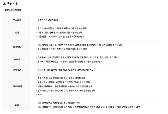- 무상수리 기간에는 소비자의 과실이 없는 경우 요금 청구 없이 무상으로 수리가 진행됩니다.