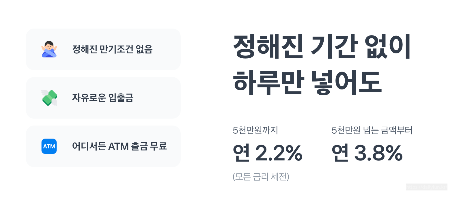 • 토스뱅크 통장 5천만원까지(세전) 연 2% / 5천만원 초과 금액에만(세전) 연 3.5%