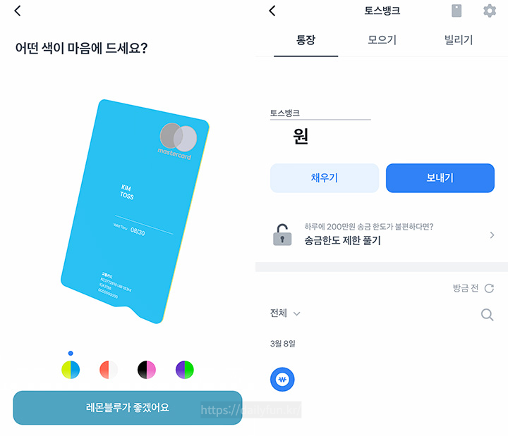 7. 인증서를 발급 받은 뒤에 실물로 받을 카드 디자인과 배송받을 주소를 선택하면 토스뱅크 통장 개설이 끝납니다. (중간에 카드에 입력할 영문이름과 해외결제 차단, 교통카드 가능 등의 옵션을 체크합니다.)
