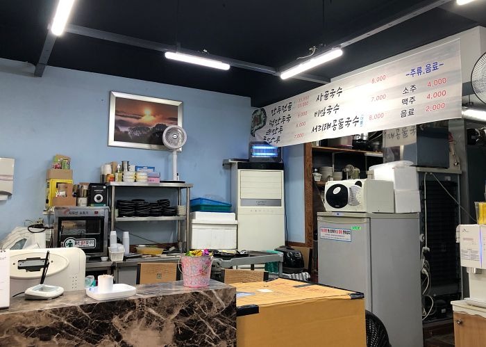 만두를 준비하는 왼쪽의 주방과 오른쪽에는 테이블 4개 정도가 놓여있습니다. 만두 만드는 공간 절반 손님 테이블 절반이며 세련된 분위기의 인테리어는 아니라서 더욱 만두의 맛이 기대됩니다.
