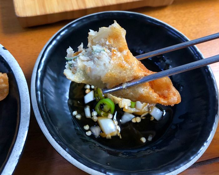 간장에 찍어서 한입 베어 물면 입 안에서 뜨거운 만두와 바삭한 식감이 젓가락을 멈출 수 없게 만듭니다. 중국집에서 바로 튀겨 나오는 군만두도 맛있었는데 이렇게 손으로 직접 만두 만들고 바로 튀기는 군만두는 정말 일품입니다.