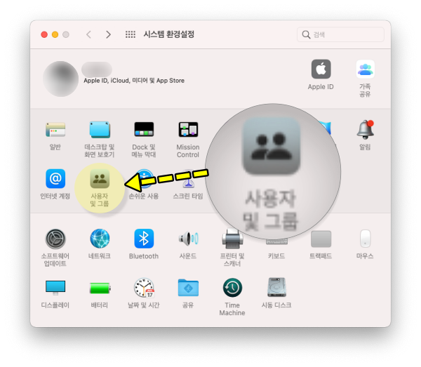 2.맥북이나 아이맥의 시스템 환결설정에서 "사용자 및 그룹" 으로 이동합니다.
