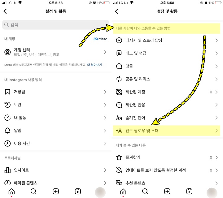 2. 설정 및 활동에서 스크롤을 계속 내려보면 "다른 사람이 나와 소통할 수 있는 방법" 탭에서 "친구 팔로우 및 초대" 항목을 선택합니다.