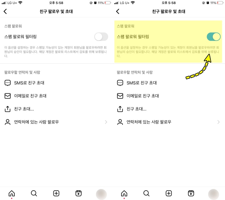 3. 친구 팔로우 및 초대에서는 "스팸 팔로워"를 차단할 수 있는 필터링 기능을 제공하고 있습니다. 해당 옵션을 설정하는 경우 스팸일 가능성이 있는 계정이 사용자의 계정을 팔로우하려면 따로 승인이 필요한 상태로 변경됩니다.