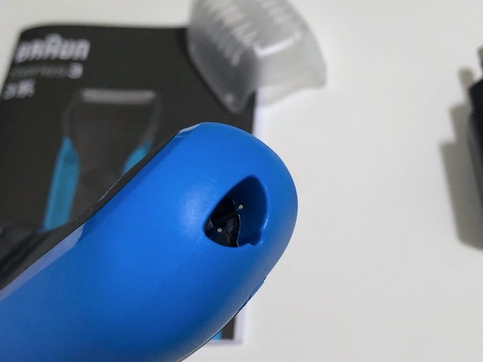 면도망은 양쪽 끝 부분을 가볍게 눌러서 면도기와 분리가 가능합니다. 여기서 진동으로 날을 움직여서 수염을 깎는 방식입니다. 청소를 게을리하면 이 부분에 수염이 자꾸 쌓여서 안좋은 냄새와 청결에 좋지 않습니다.